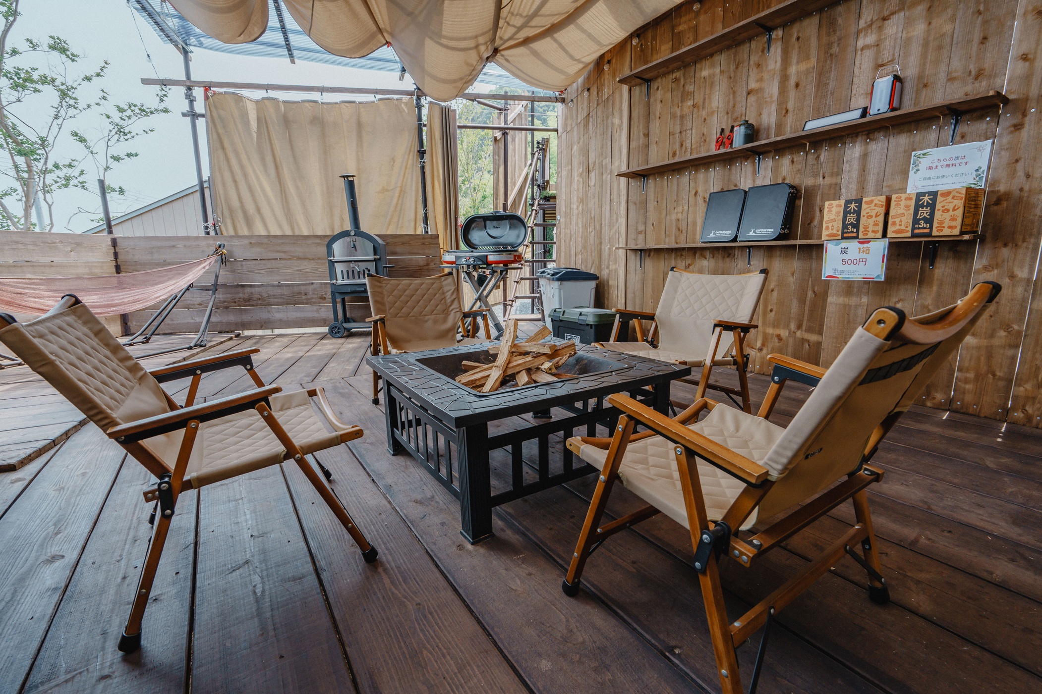 薪スペースではベンチに座って火を眺めたり、マシュマロを焼いたりもできる癒しの空間となっています。