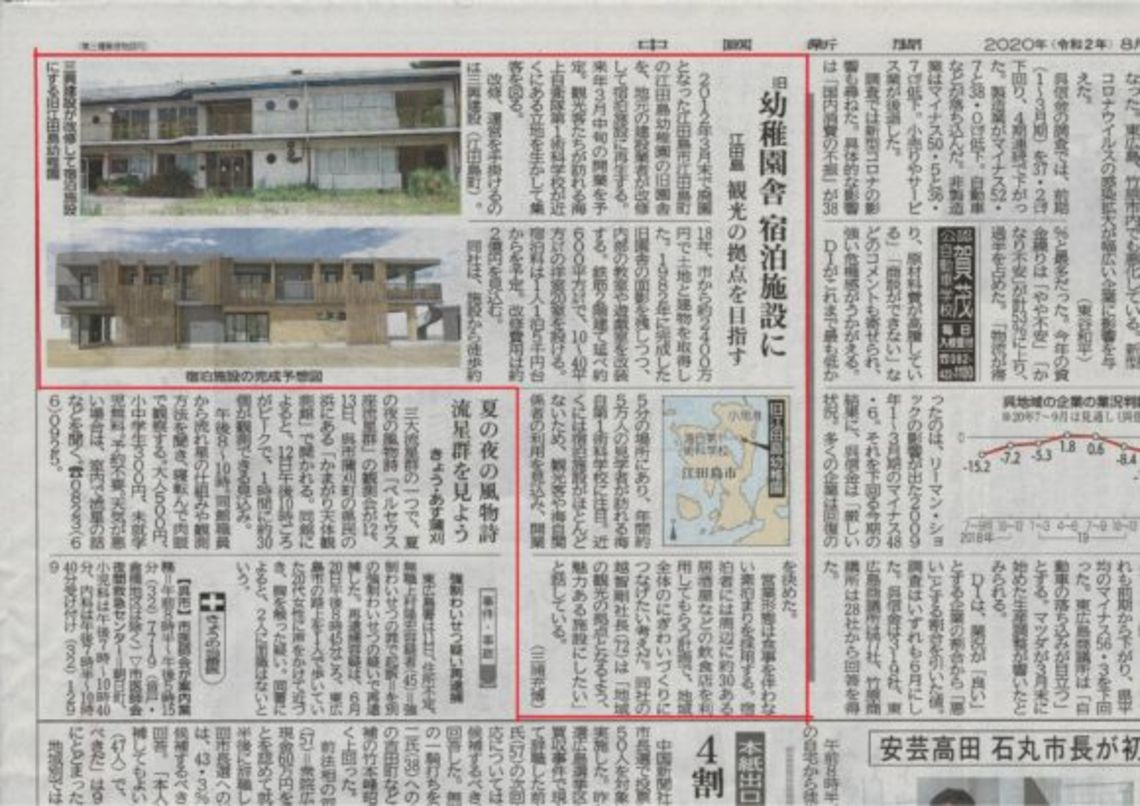 2020.8.162021.11.11 江田島ホテルプロジェクト 新聞掲載 広島設計事務所ブログ 以前より設計を進めております江田島のホテル改修プロジェクトですが、いよいよ来月工事着手予定です。 8/12付の中国新聞にプロジェクトの概要が掲載されたのでご紹介します。 今回の計画が江田島の活性化につながったら嬉しく思います。 Posted on by 羽田佑輝