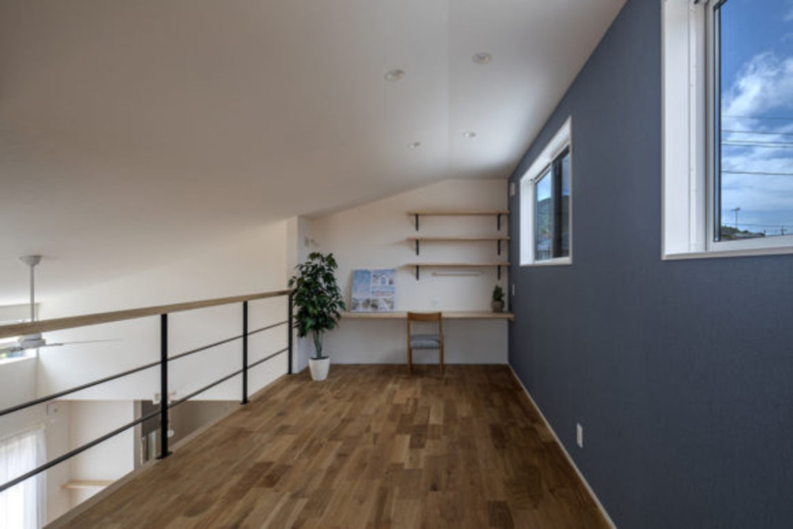 間取りはほぼ平屋で、一部2階のフリースペースがリビングの吹抜けとつながっているプランです。