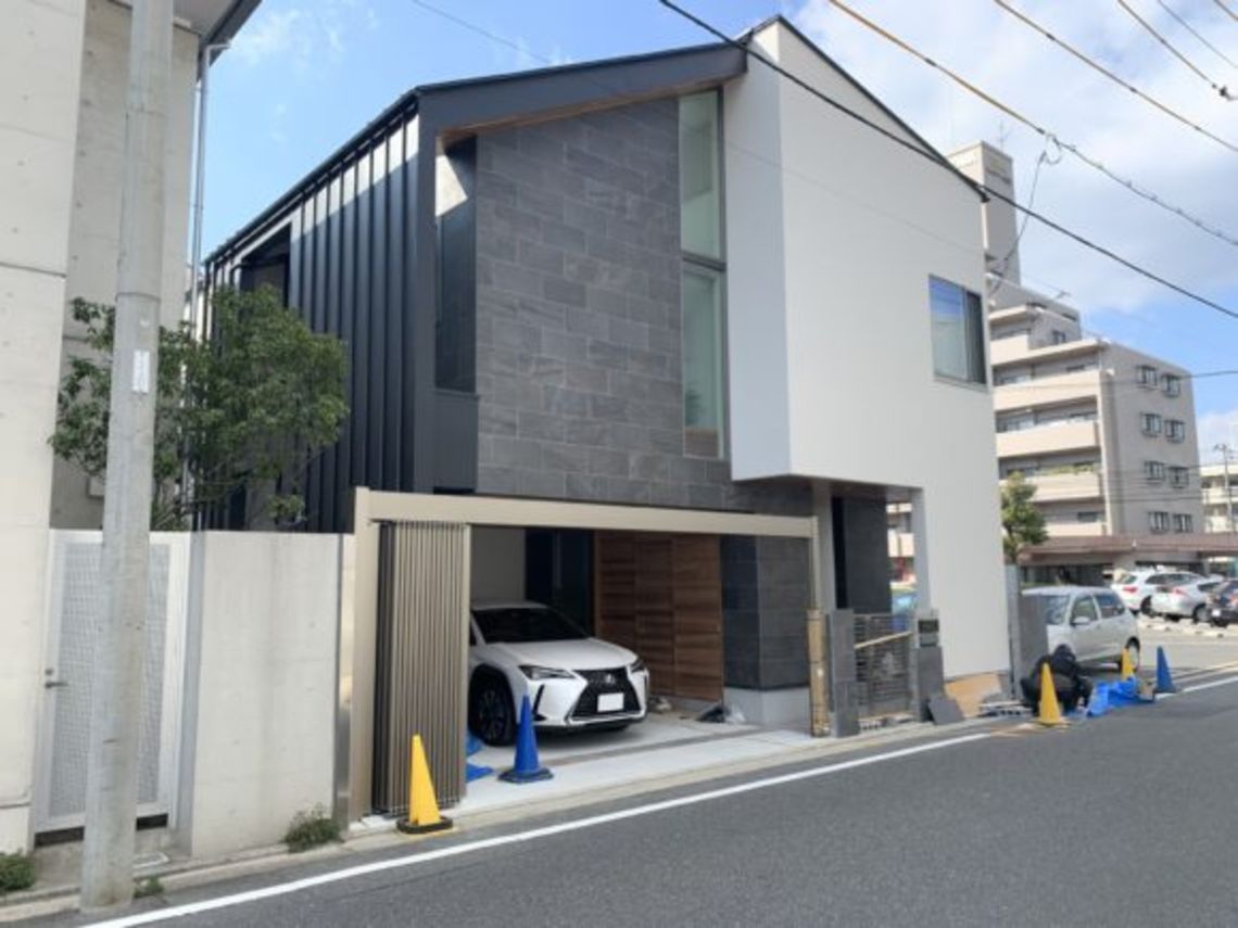 外構はほぼ完了まで進んでいて、ガレージシャッターも設置されています。