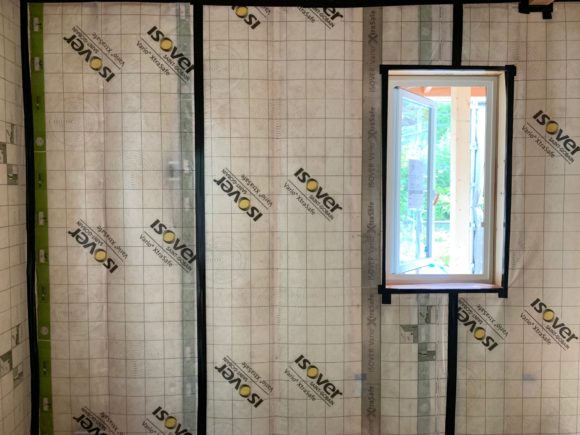 グラスウール断熱材の場合は室内側に気密シートを張るのですが、