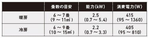この表の場合、暖房性能が6~7畳、冷房性能が6~9畳程度と読みがちですが、「木造住宅なら暖房性能6畳と冷房性能6畳、鉄筋住宅なら暖房性能7畳、冷房性能9畳」という表記のようです。