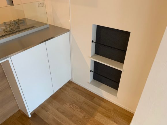 壁にはニッチを設置したので本を収納したり
