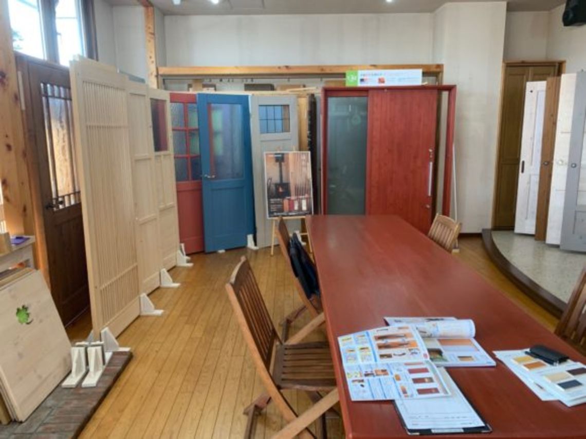 検討中の薪ストーブと、木製玄関扉についてお施主様と実物を見学に行きました。