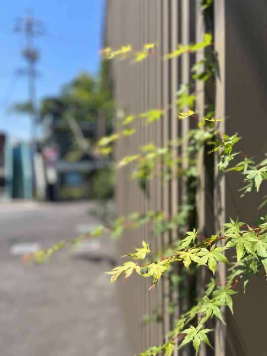 建物のルーバーの隙間から除く植物が、