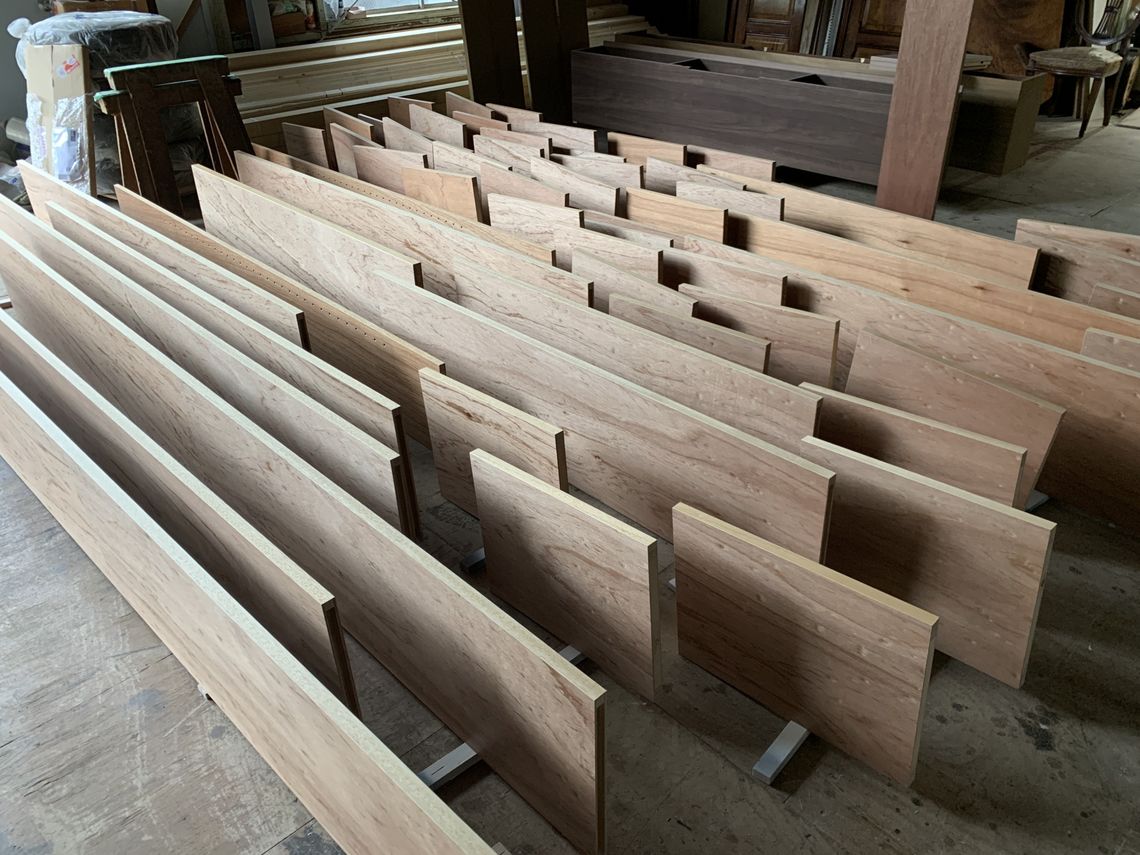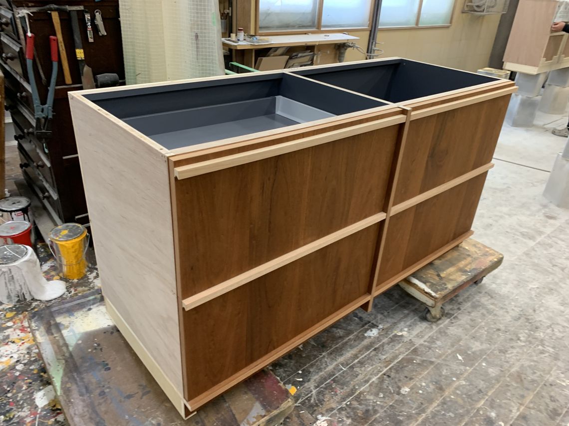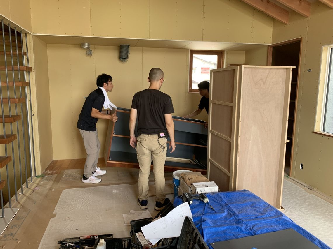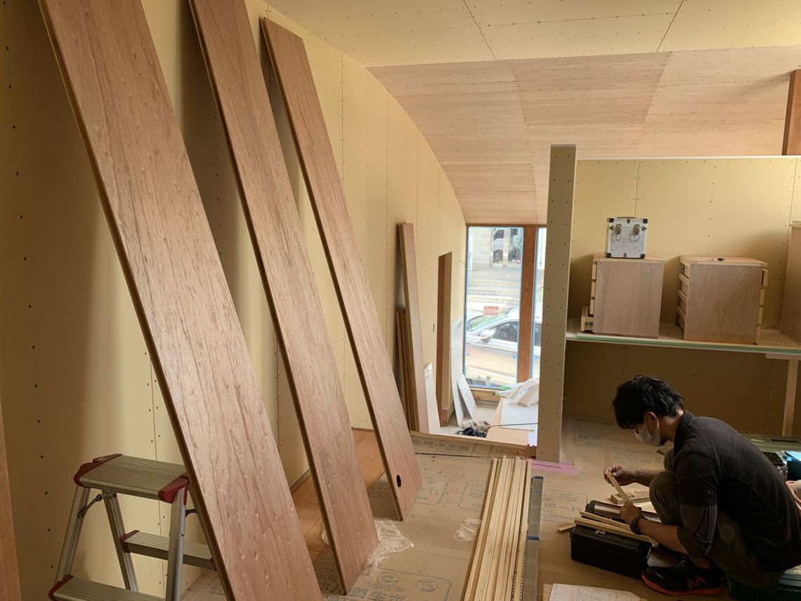 2021.10.42021.11.9 家具工事 広島設計事務所ブログ 大工工事も終え、これから内部の壁や天井を仕上げていく内装工事に入ります。 その前に、キッチンや洗面台などの家具を製作したので、搬入します。先に壁や天井を仕上げて家具を設置すると天井や壁を傷つけてしまう可能性もあるためです。 設置前に、家具製作工場の様子を見学しましたのですが、家具ができるまでの裏側を見ることができ、大変勉強になりました。 キッチンなどの家具は、ある程度完成したものを現場にはめていくのですが、この棚は現場にあわせて一枚ずつ組み立てていきます。 Posted on by 羽田佑輝