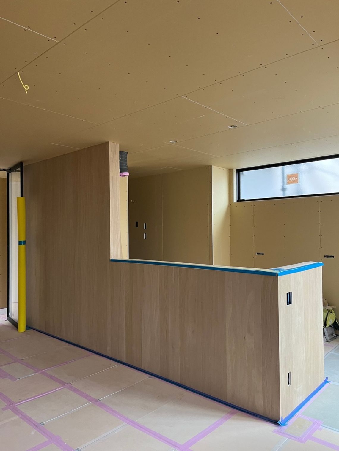造作カップボードも同様なイメージの縦張り仕上げにする予定で、統一感がでそうです。