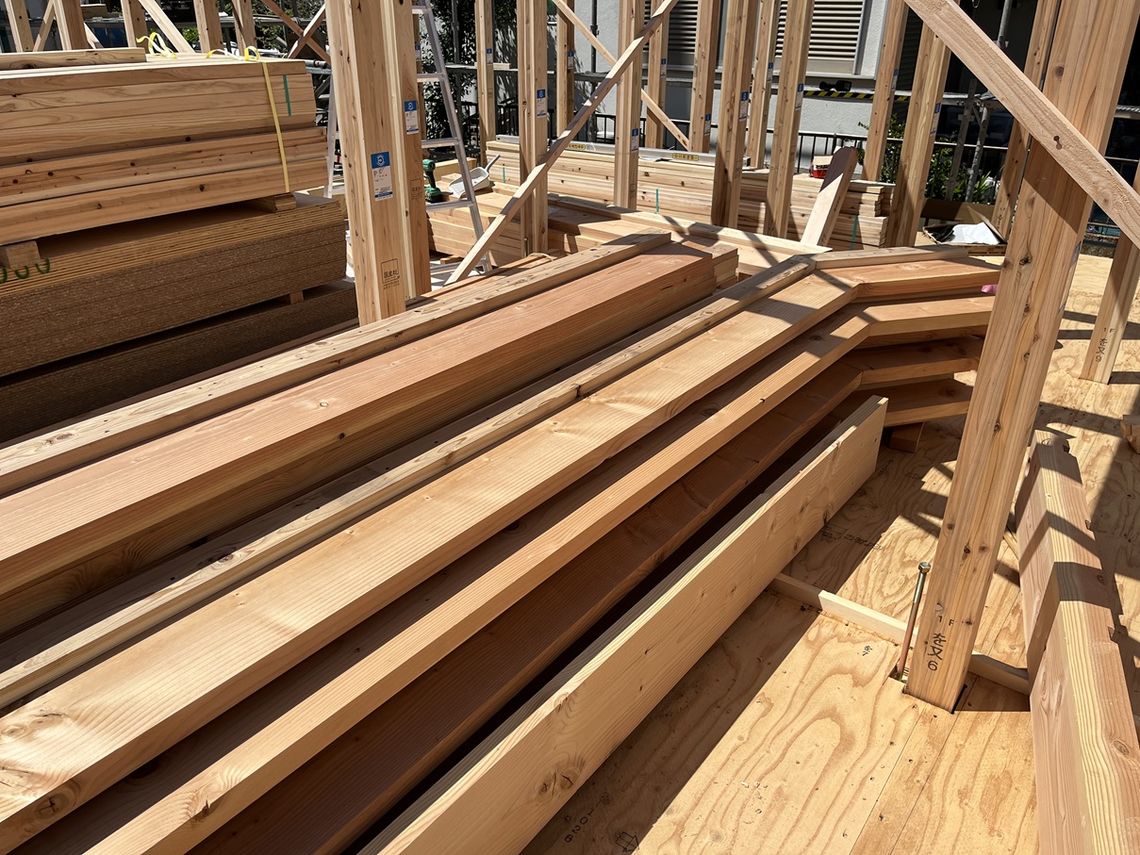 登り梁同士がぶつかる棟頂部には棟木という大きい材料が入るのですが、