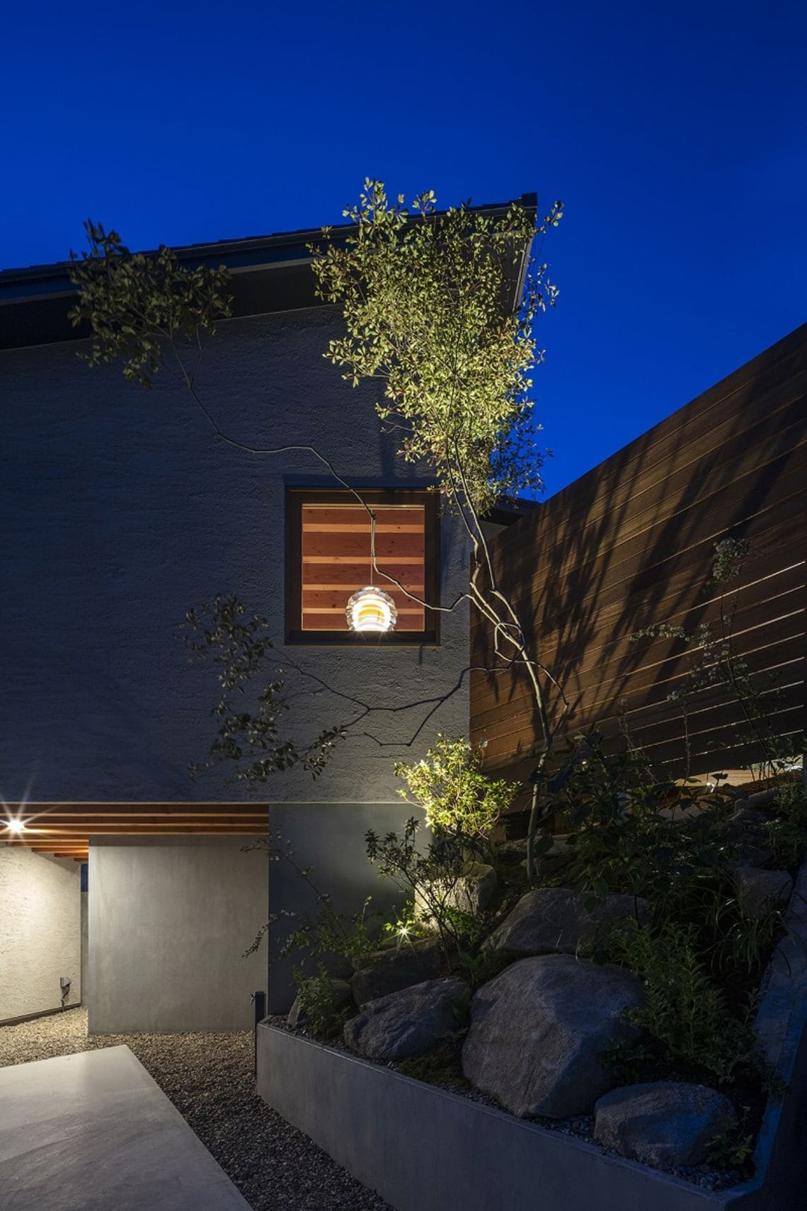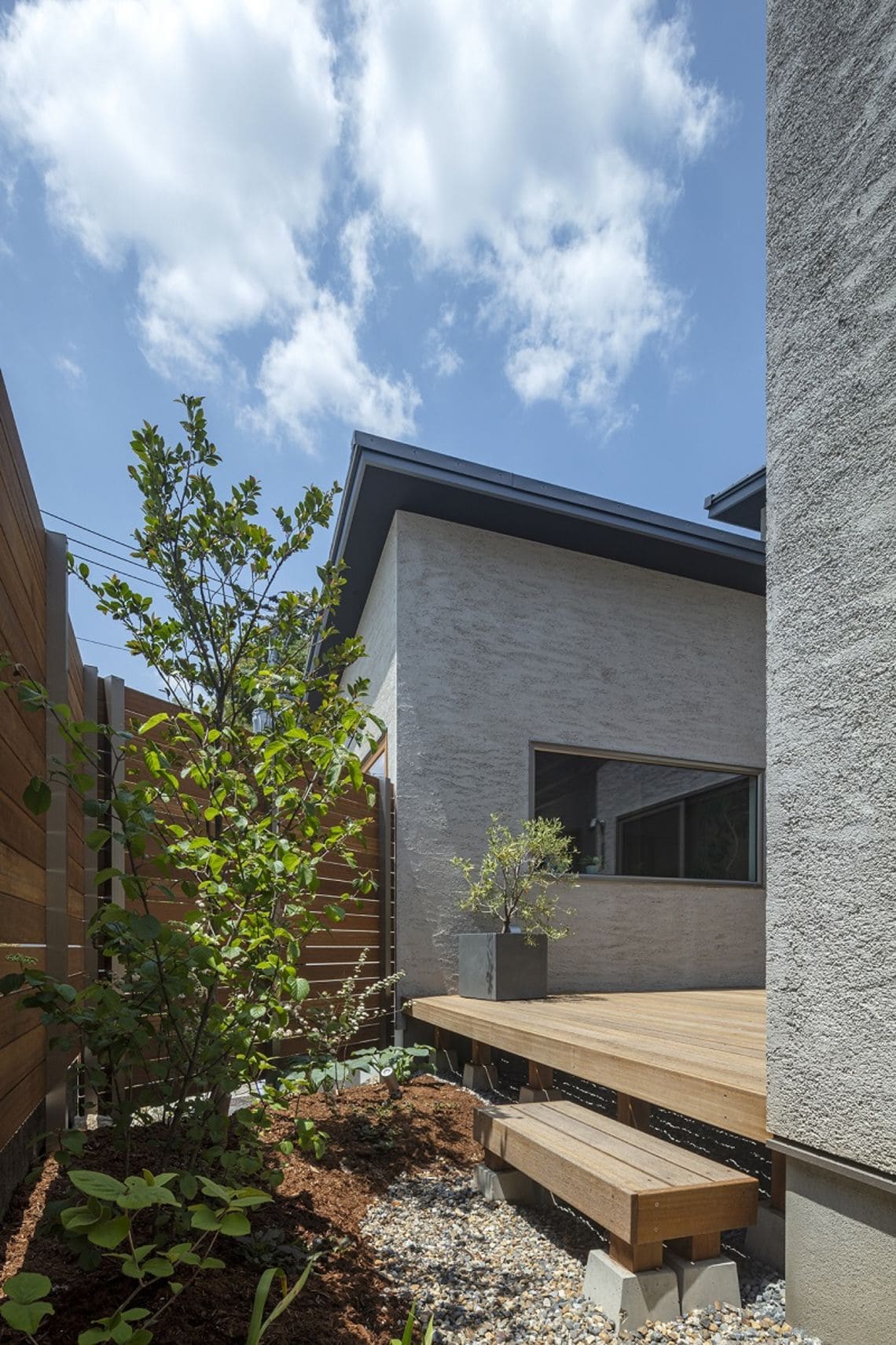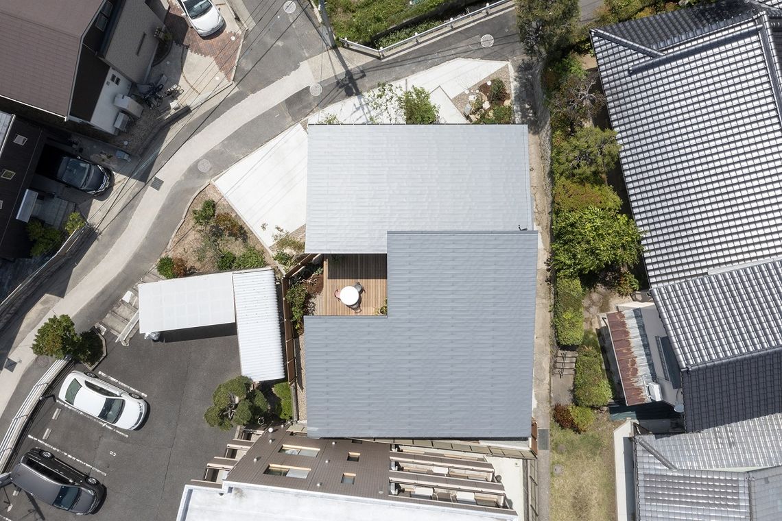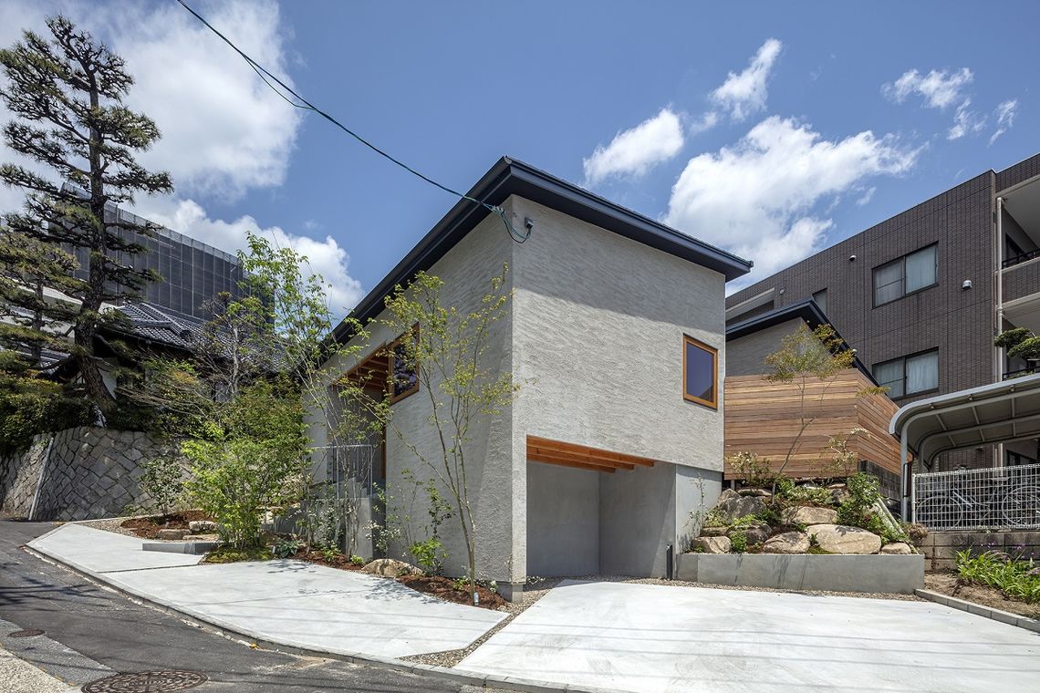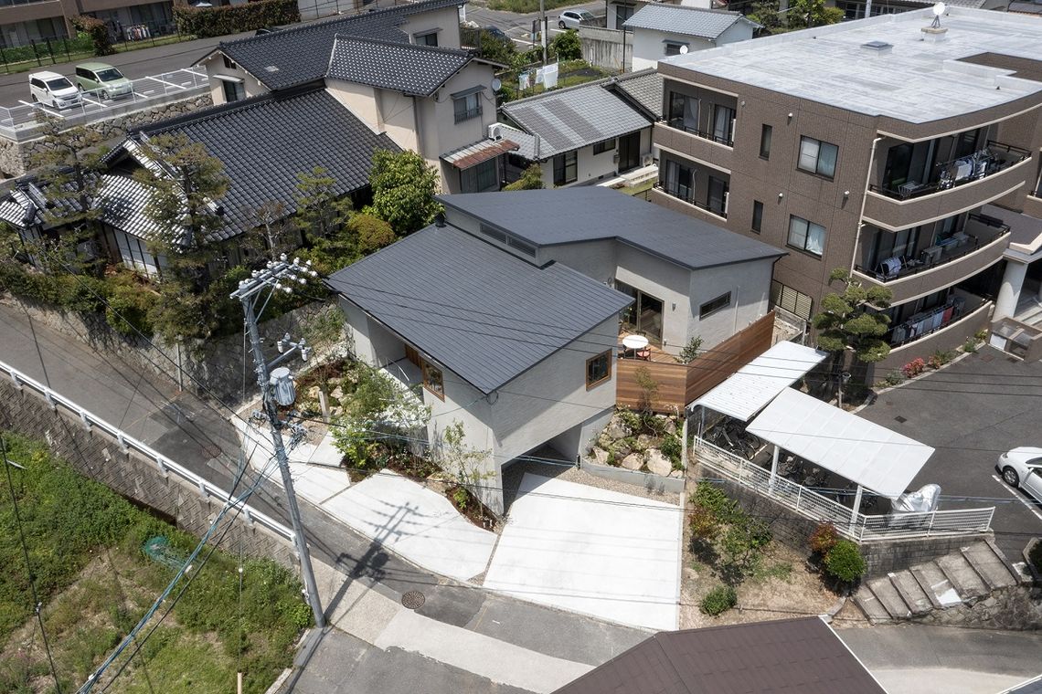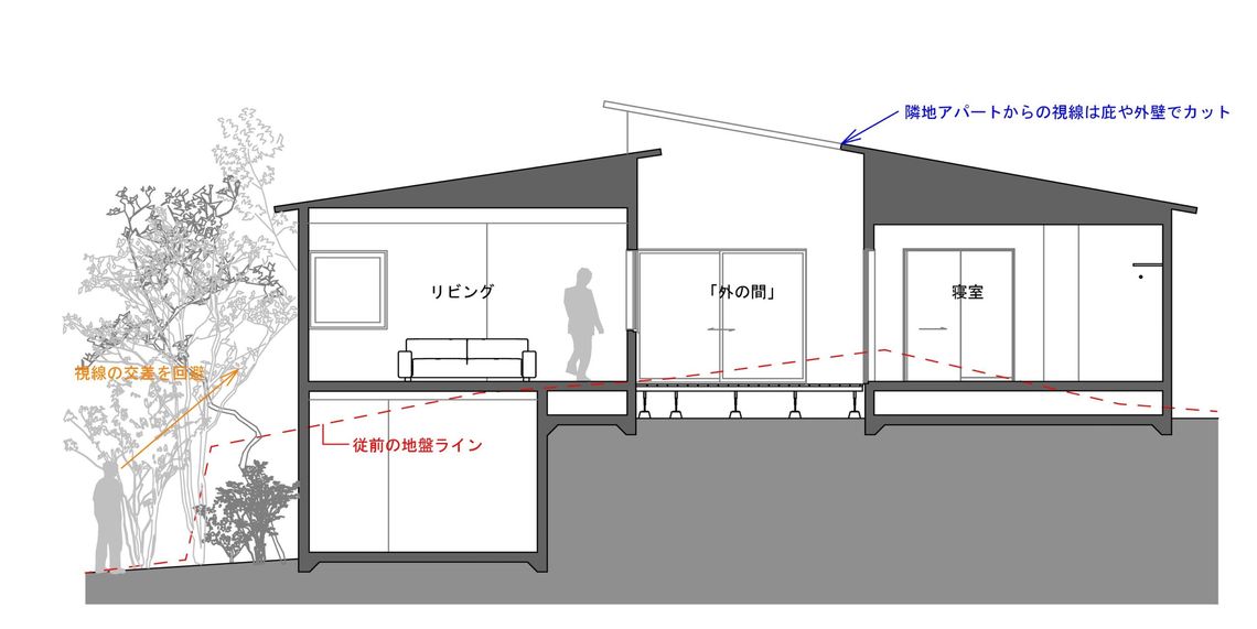 道路との高低差を活かし、道路からの視線と内部の視線との交差を防ぐことと併せて、高低差によって駐車場部分と庭部分が明確に分離されることで、プライベートな庭空間の確保が可能となりました。