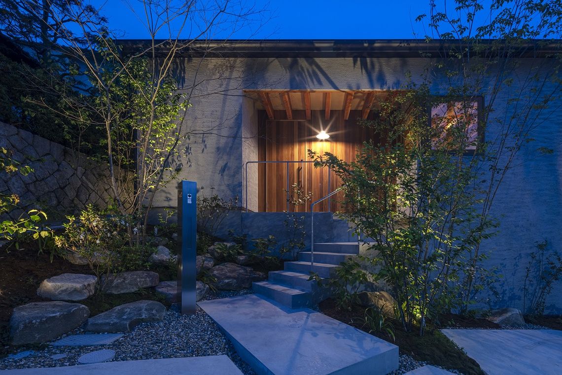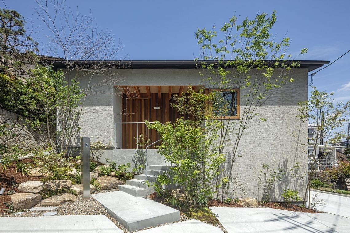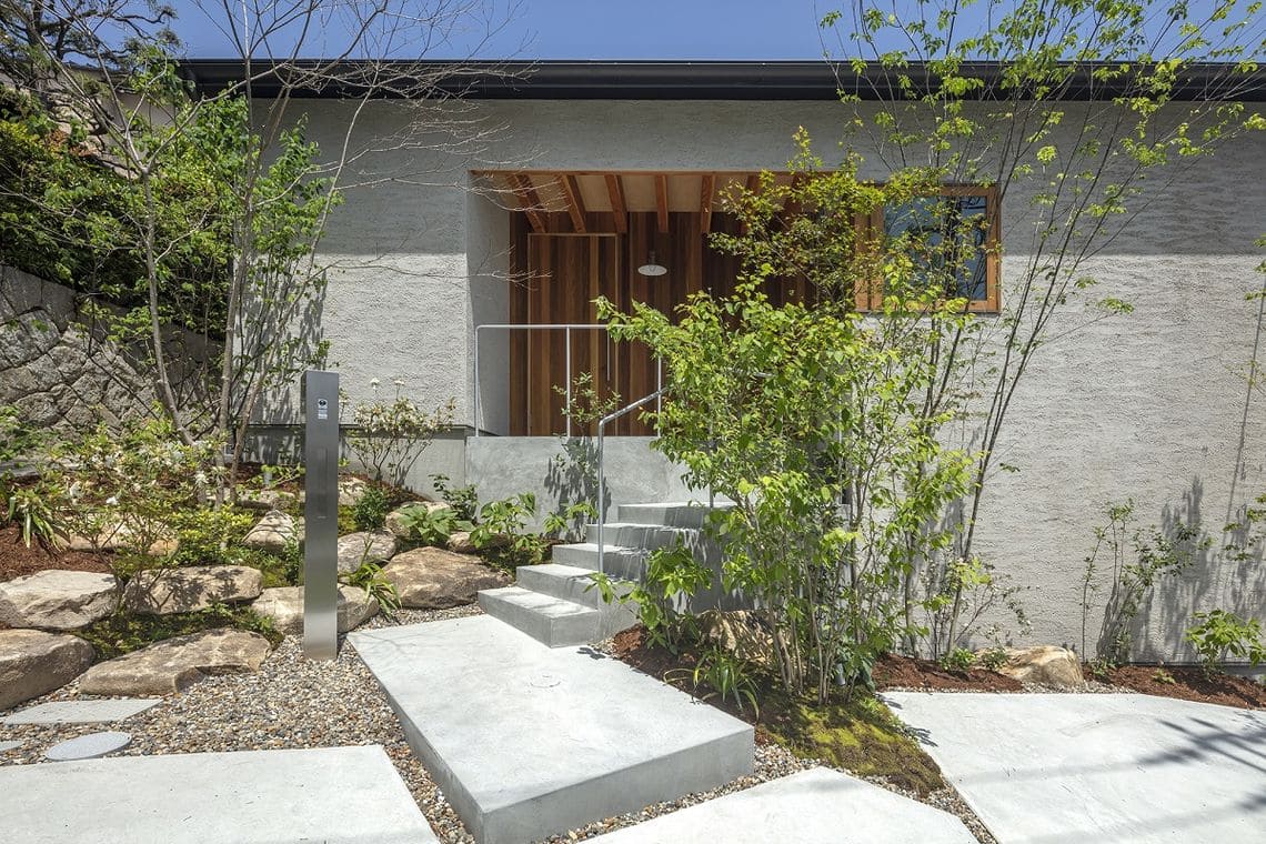 敷地と道路との高低差は、植栽を配置して森の中を抜けるような雰囲気のアプローチ階段により解消し、建物内部は段差のないフラットで使いやすい計画としています。