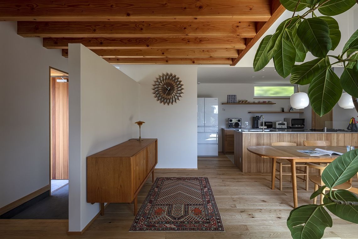 玄関ホールやリビングの天井には化粧梁を設置し、ダイニングは吹抜けとしているので、視覚的な空間の変化を楽しむことができ、開放感やぬくもりも感じることができます。