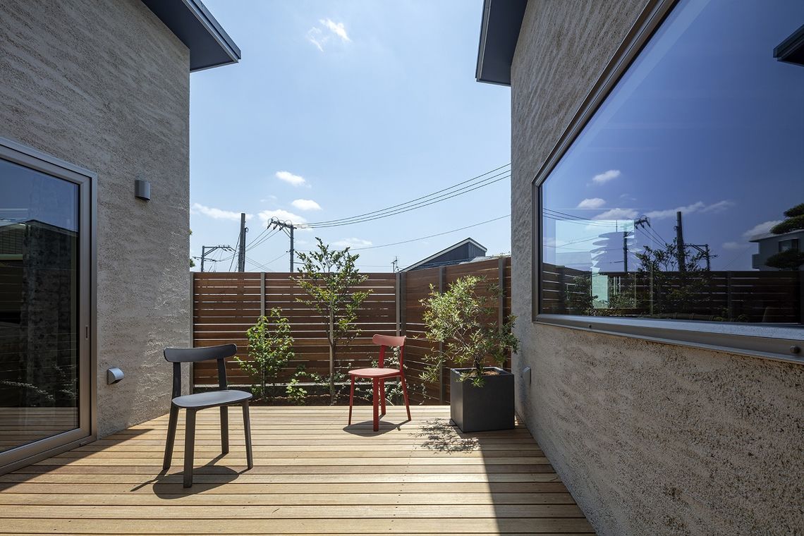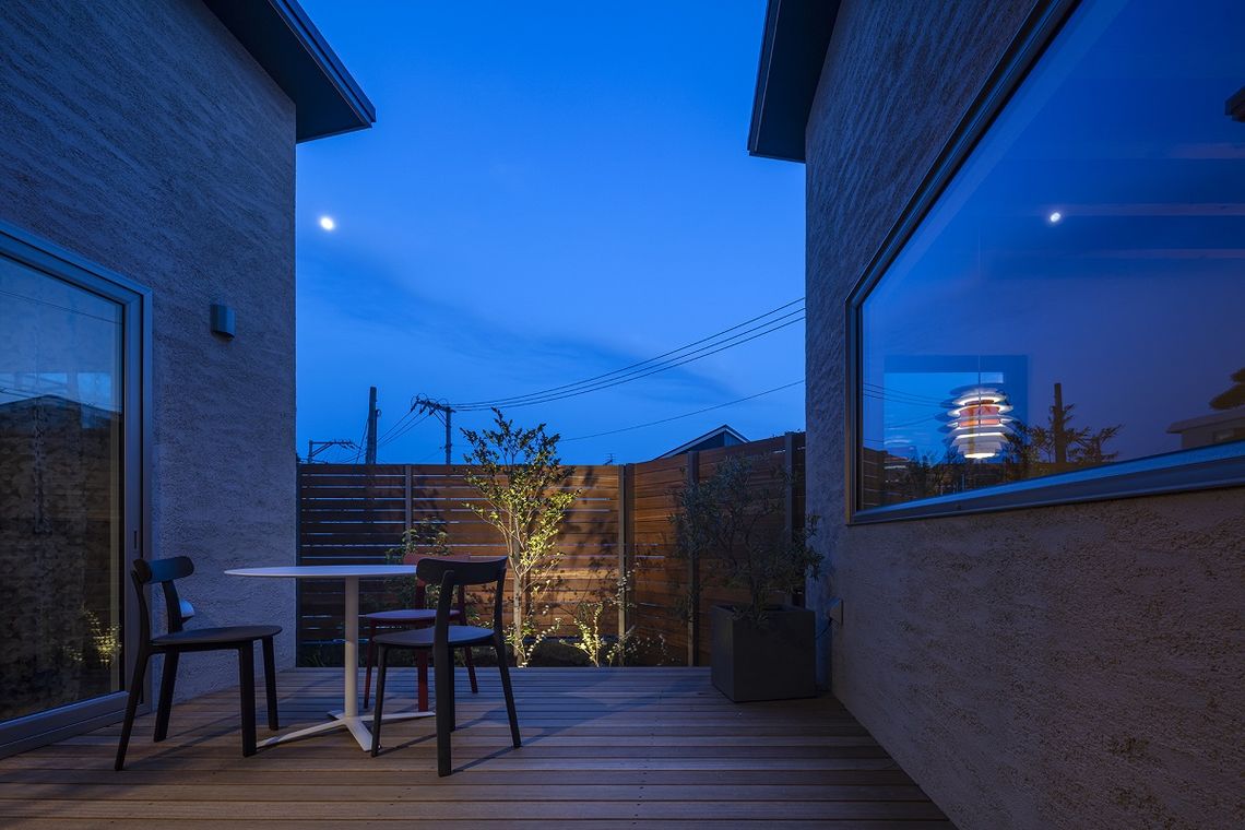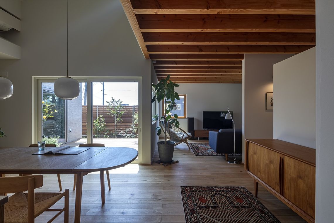 光や風が建物内にいきわたるように建物中心に配置した中庭「外の間」により、外の景色や光や風を室内に取り入れつつ、木板塀により外部からの視線をカットし、プライバシーを確保する間取りとしました。