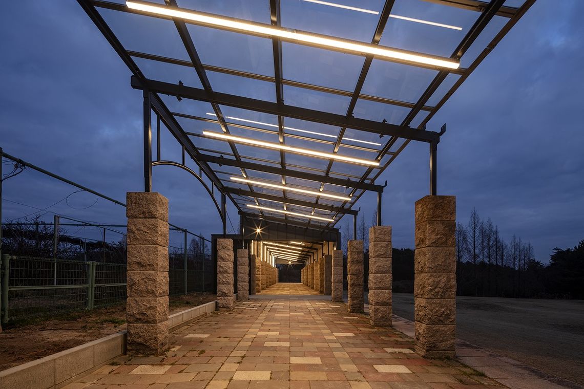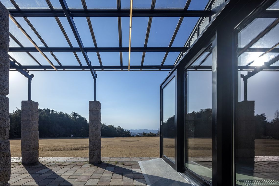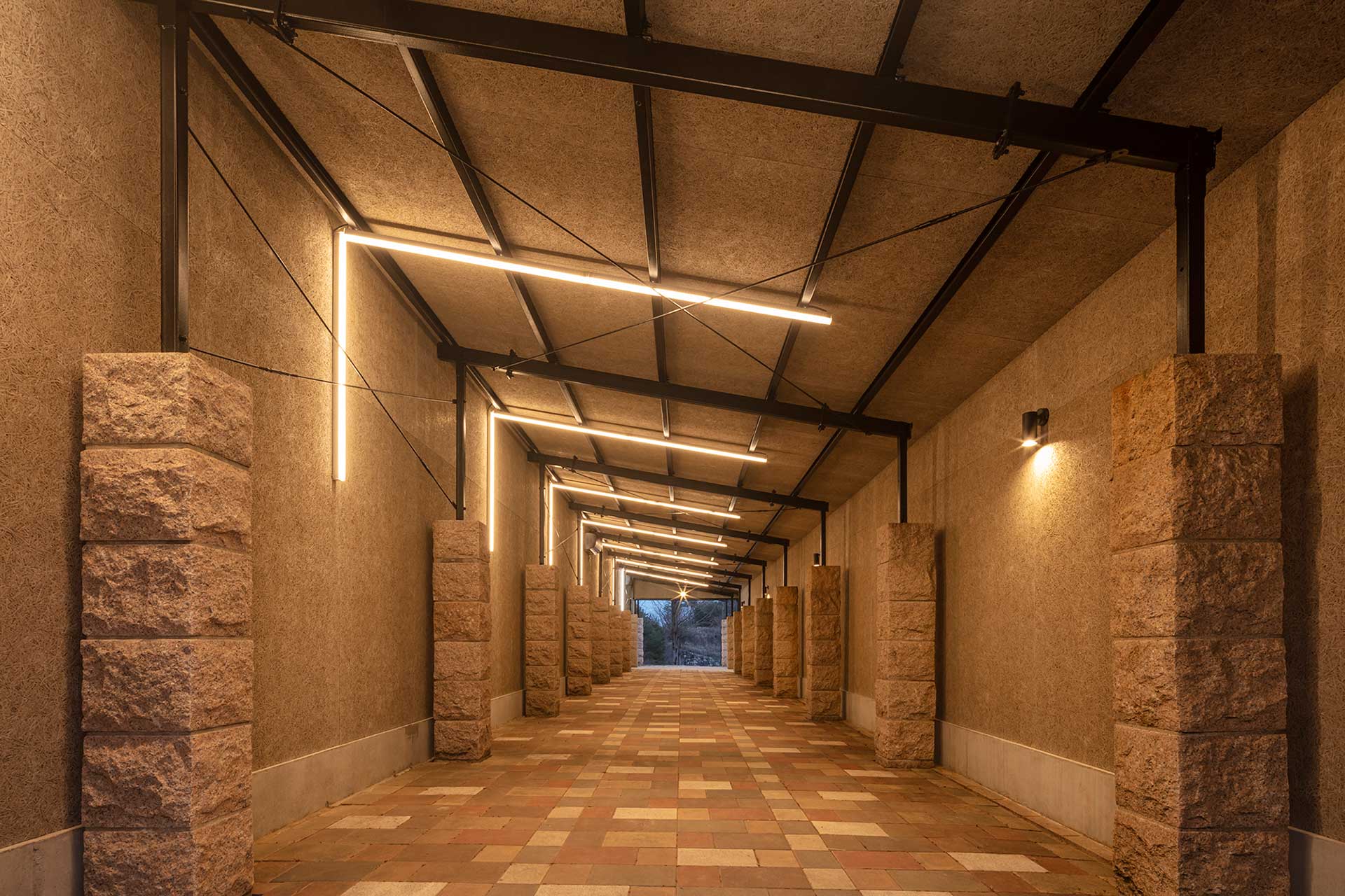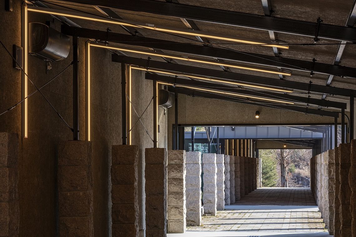 通常時は醸造の温度管理のため開口部は閉めきり、ワイナリーとして機能するが、開口部を開け放つことで、既存の石柱と鉄のフレームが連なる、1つの回廊となる。