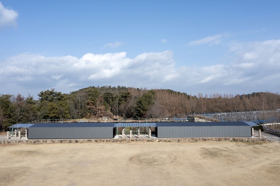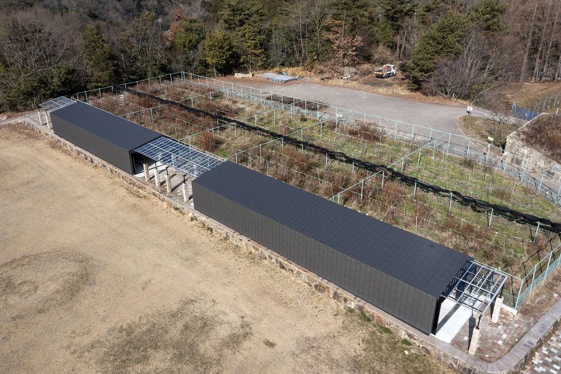 果樹園の片隅で使われなくなり放置されていた既存テラスを外殻で覆い、多目的ワイナリーにコンバージョン(変換)した。