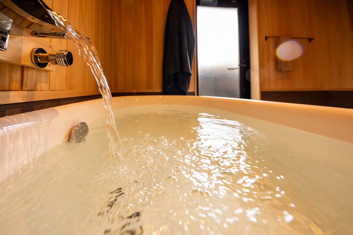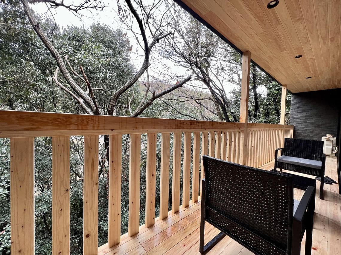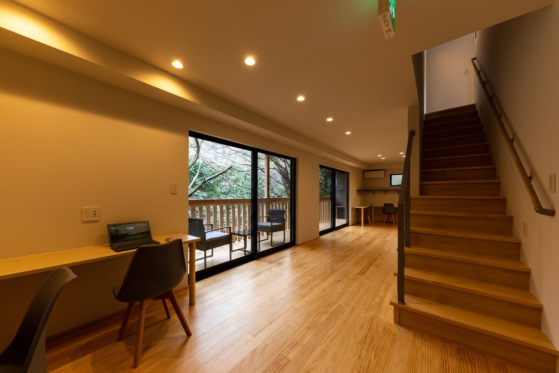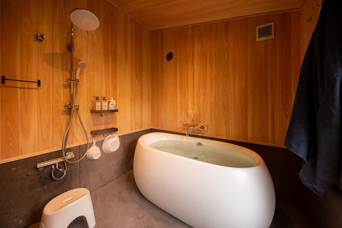 2階は水廻りが付属した個室サウナ2室、1階は森を臨むフリースペースとなっている。フリースペースはコワーキングスペースとしても利用可能。セルフロウリュ可能な薪式サウナと、地下100mからくみ上げた井戸水風呂に入浴後は、森林に囲まれたウッドデッキ上でゆったりと整うことができる。