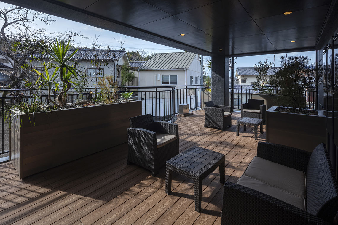 落ち着いた色遣いと、点在する植栽により落ち着いてくつろぐことができる空間となっている。