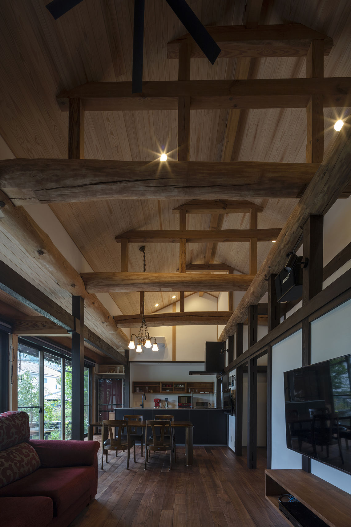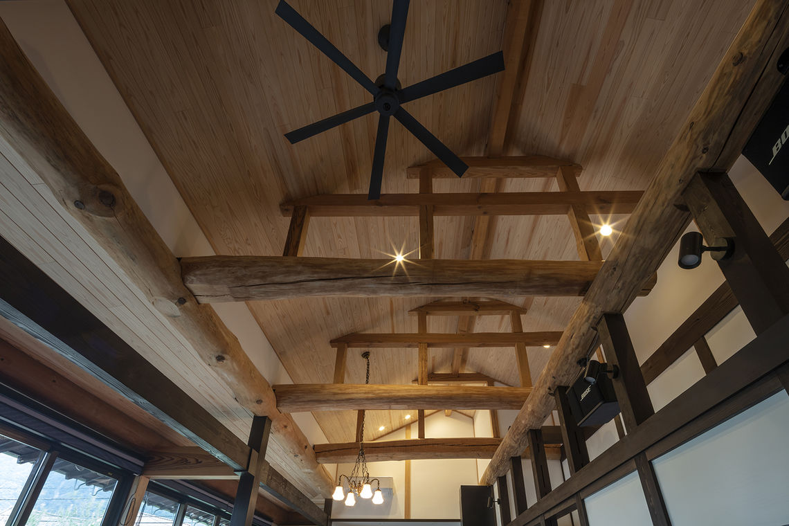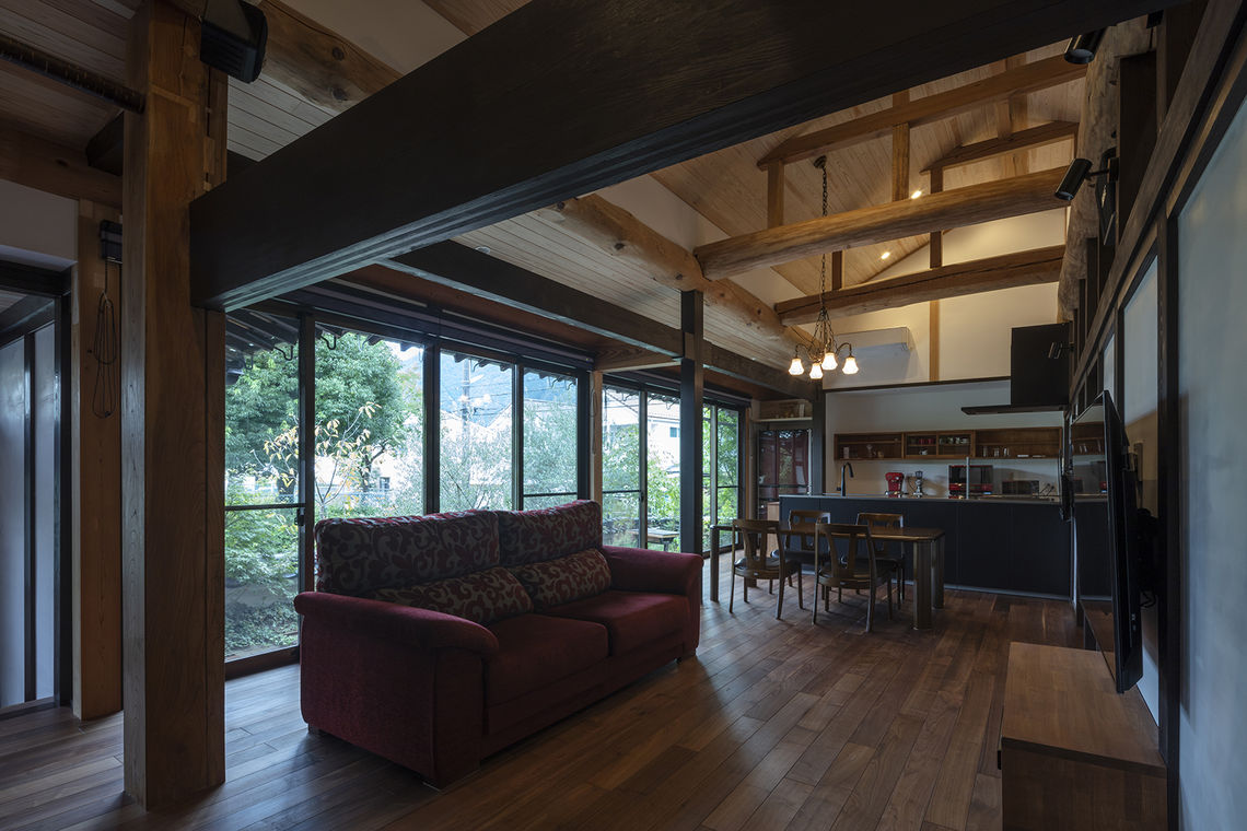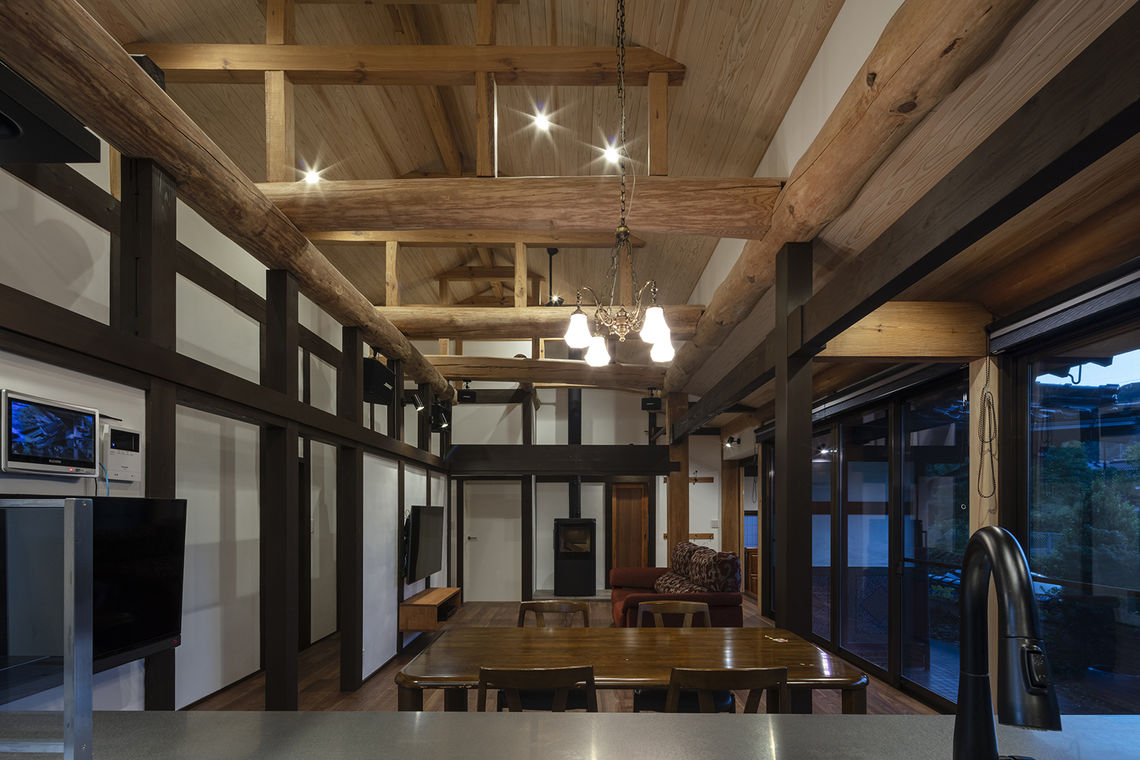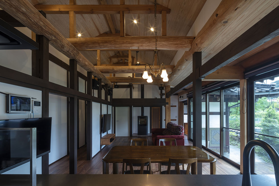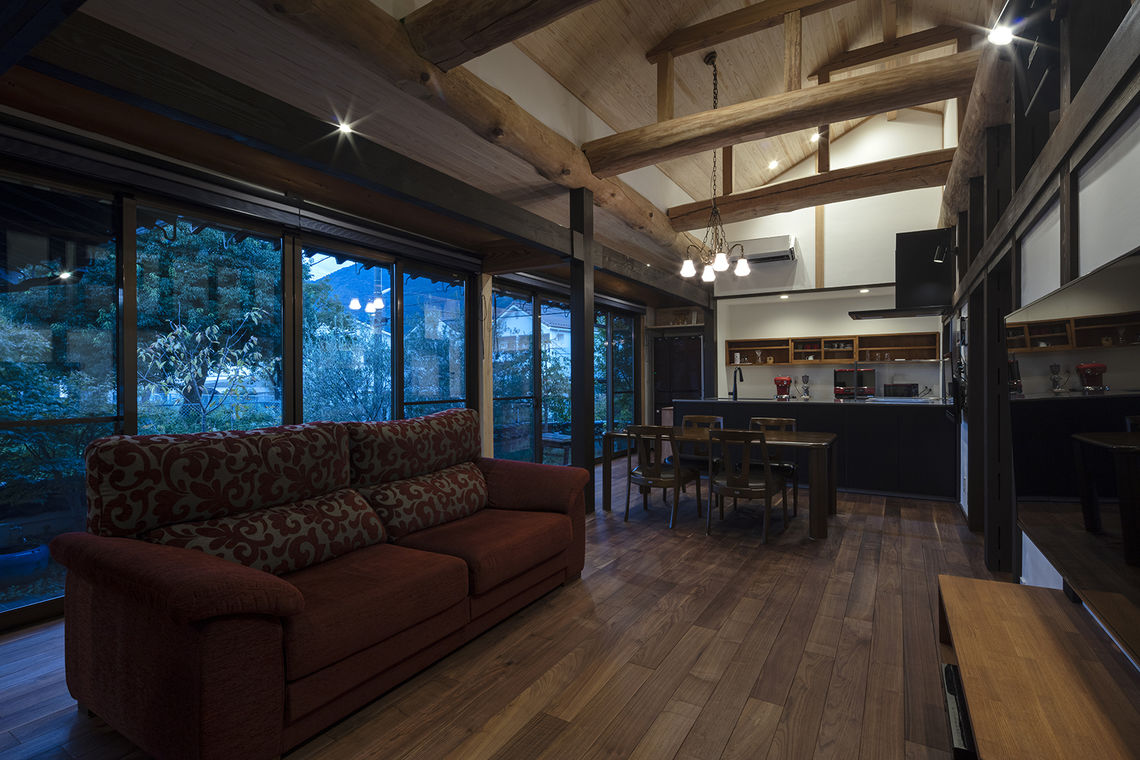 無断熱だった床と天井に断熱材を施工し、西側からの日射を受けていた窓を高断熱サッシに交換。キッチンを移動し、LDKと廊下やホールを一体的な空間として使用が可能。開放感を確保するために天井を勾配にすると、天井裏に隠れていた梁が現れ、新築にはない趣のある空間となっている。